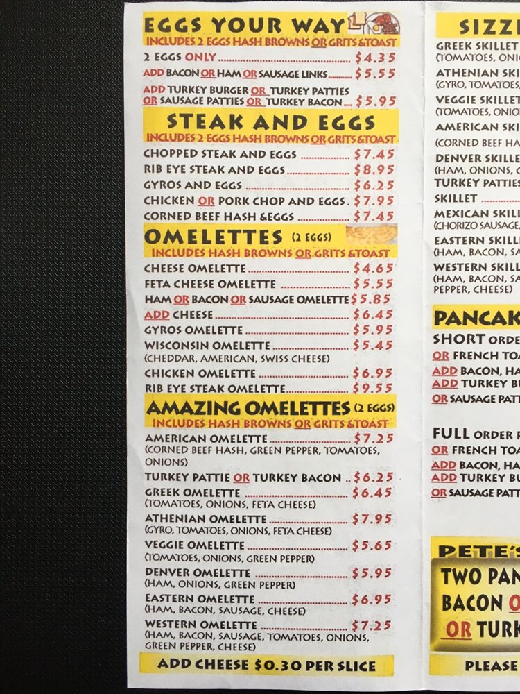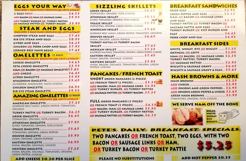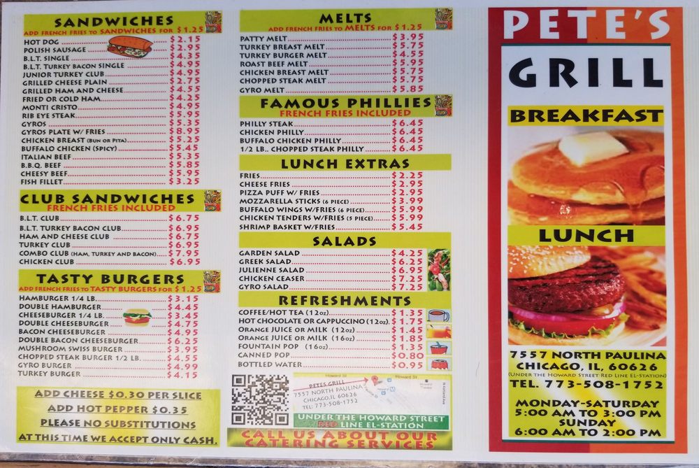 Located in Chicago, Pete's Grill is a fast-food spot specializing in breakfast and brunch. Known for its all-day lunch and dinner options like the popular Club Sandwiches and Famous Phillies, this spot offers a variety of tasty dishes. With options for delivery, takeout, reservations, and even catering, Pete's Grill caters to a wide range of customers. The menu features items like Quesadillas, Cheesy Fries, and Crispy Chicken Sandwiches. Customers have praised the friendly service and reasonable prices, making it a go-to spot for diner food. Despite a change in ownership, loyal patrons have noted that the quality of the food remains consistent. Whether you're looking for a quick bite or a hearty meal, Pete's Grill has something for everyone.